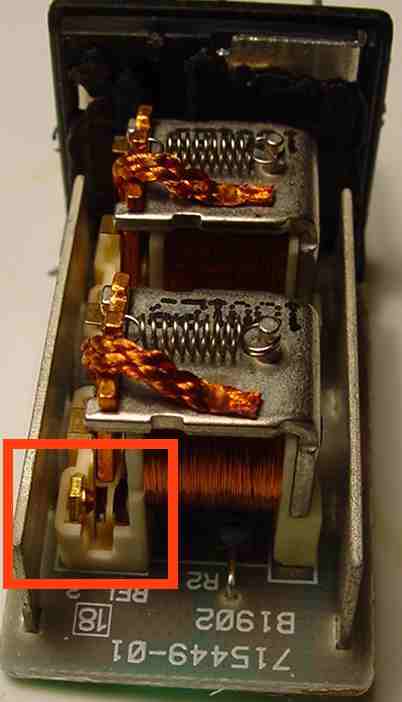 The module changed internal construction around 1992 from the one presented here - this is my 1987 one. Click here to see the front (or the back) of the single curcuit board for the later module. The part below about finding & resoldeing the contacts for the relays still applies.